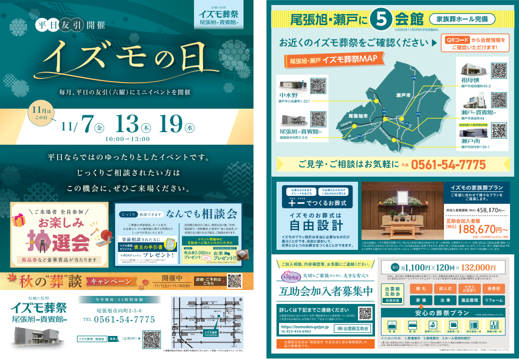出雲殿互助会新着情報11月7日(金),13日(木),19日(水)イズモの日 イズモ葬祭 尾張旭貴賓館