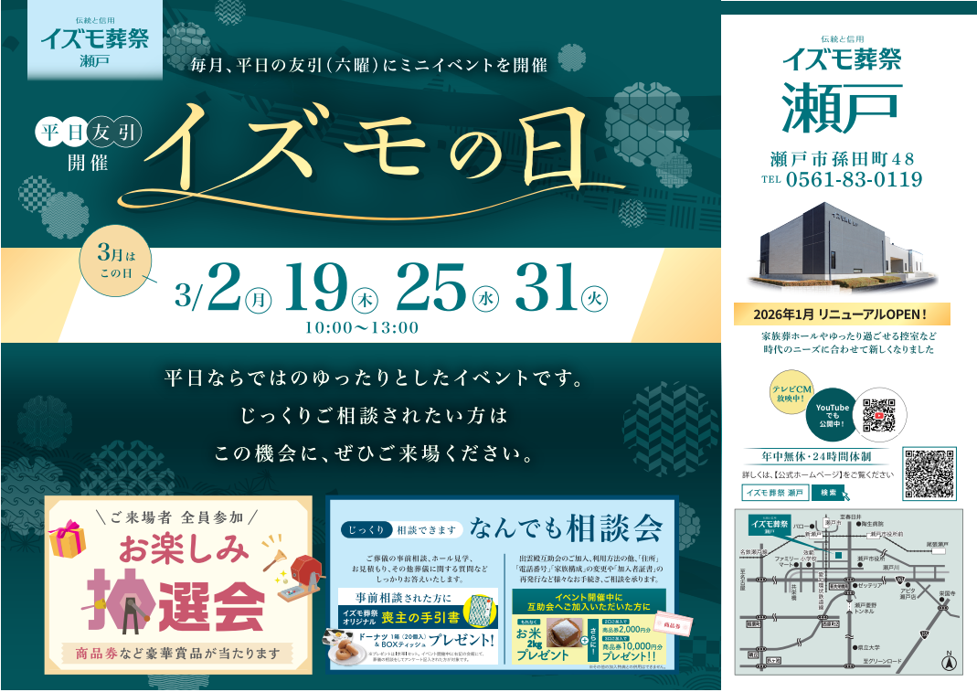 出雲殿互助会新着情報3月2日(月),19日(木),25日(水),31日(火)イズモの日 イズモ葬祭 瀬戸