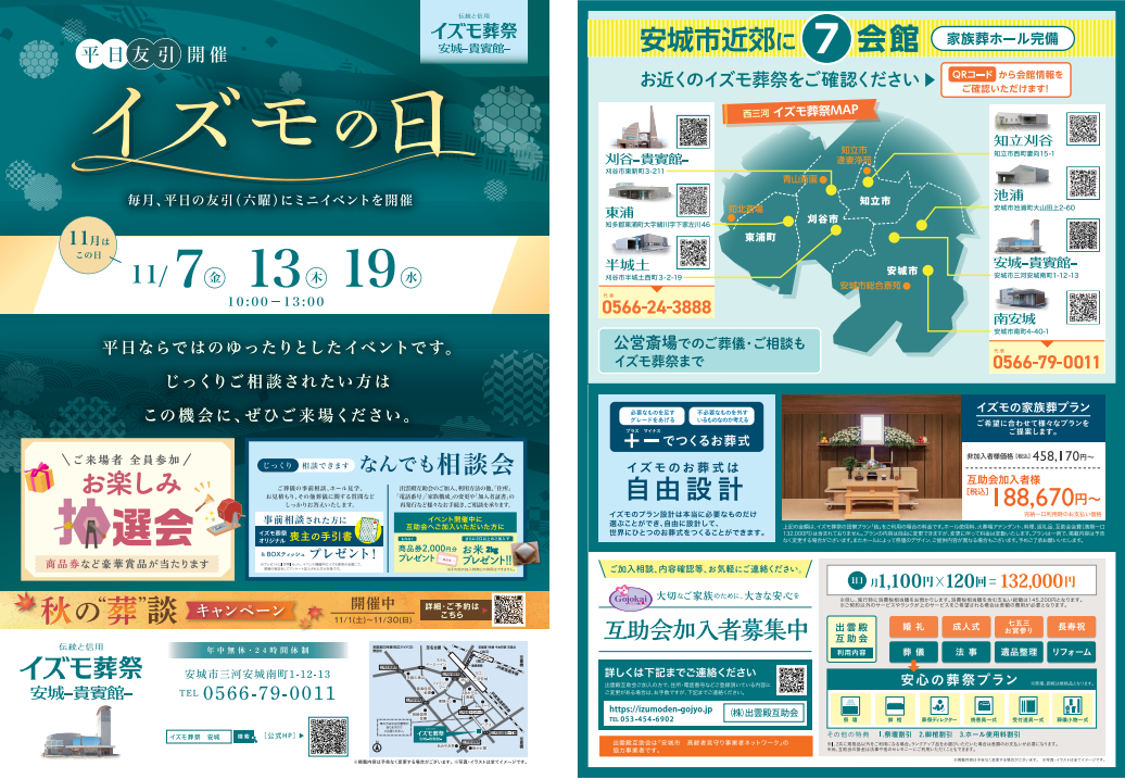 出雲殿互助会新着情報11月7日(金),13日(木),19日(水)イズモの日 イズモ葬祭 安城貴賓館